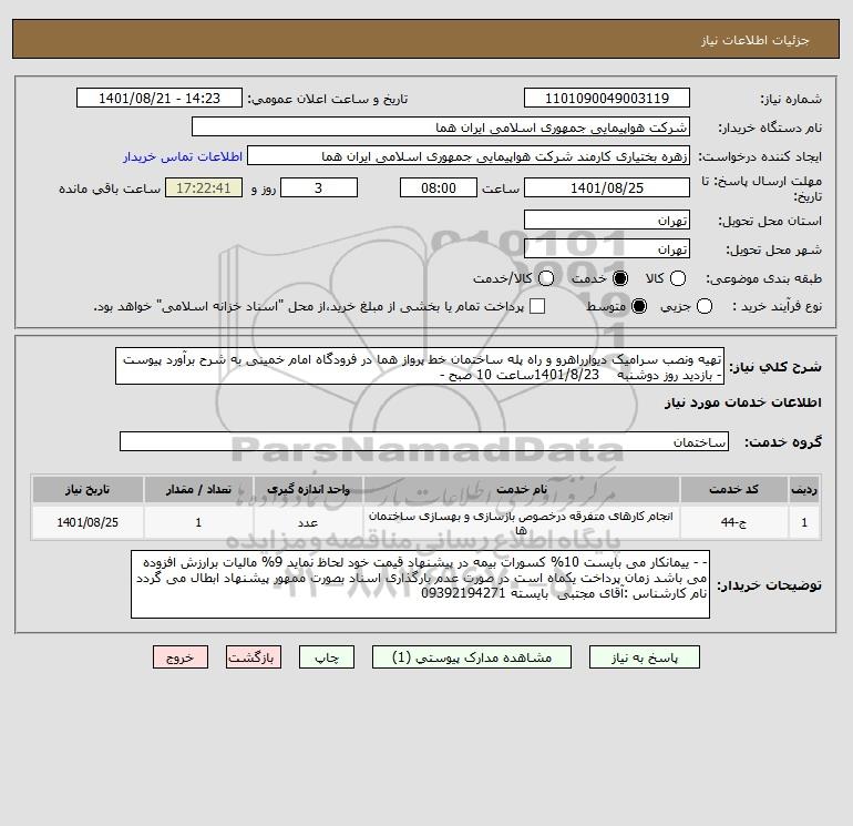 شرح کلی نیاز: تهیه ونصب سرامیک دیوارراهرو و راه پله ساختمان خط پرواز هما در فرودگاه امام خمینی به شرح برآورد پیوست - بازدید روز دوشنبه 1401/8/23ساعت 10 صبح -