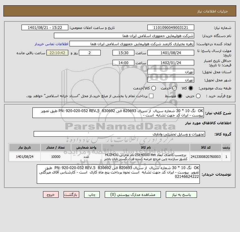 شرح کلی نیاز: OK تگ 10 * 30 شماره سریال از سریال 820693 الی 830692 PN: 920-020-052 REV.5 طبق تصویر پیوست - ایران کد جهت تشابه است -