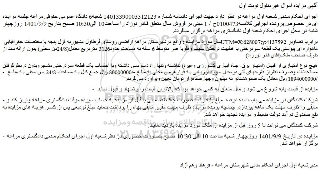 - مزایده در تاریخ 1401/9/9 روزچهار شنبه ساعت 10 الی 10:30 صبح بصورت حضوری در دفترشعبه اول اجرای احکام مدنی دادگستری مراغه برگزار خواهد شد.