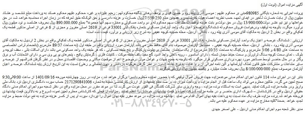 پرونده اجرایی به شماره بایگانی 980985مبنی بر محکوم علیهم : موسی آذری پیله رود و حسین محمدی و یوسف وهابی ینگجه محکوم لهم : رحیم علیزاده و غیره ،محکوم علیهم محکوم هستند به پرداخت مبلغ ششصد و هشتاد میلیون ریال از بابت خسارت تأخیر در ایفای تعهد حسب نظریه اعضاء هیأت کارشناسی و همچنین مبلغ 27/559/250ریال خسارت و هزینه دادرسی و حق الوکاله طبق تعرفه که در زمان اجراء محاسبه خواهد شد در حق خواهانها و نیز نیم عشر دولت13/900/000 ریال در حق دولت،و بابت هزینه نواقصات مشاعات سهم محکوم له و دو واحد مسکونی و مغازه سهم آنها مجموعا" بمبلغ 890.000.000 ریال بحروف هشتصد و نود میلیون ریال برآورد میگردد باتوجه به توقیف ودرخواست فروش محکوم له ششدانگ عرصه و اعیان یک واحد آپارتمان مسکونی بشماره پلاک ثبتی 33001 فرعی از 2619 اصلی مفروز و مجزی از 6 فرعی از اصلی مذکور قطعه یک تفکیکی واقع در بخش 2 اردبیل به مالکیت آقای موسی آذری پیله رود ، بنشانی اردبیل- محله حسینیه کوچه عفیفی ،به شرح زیر ارزیابی و برآورد قیمت شده است؛