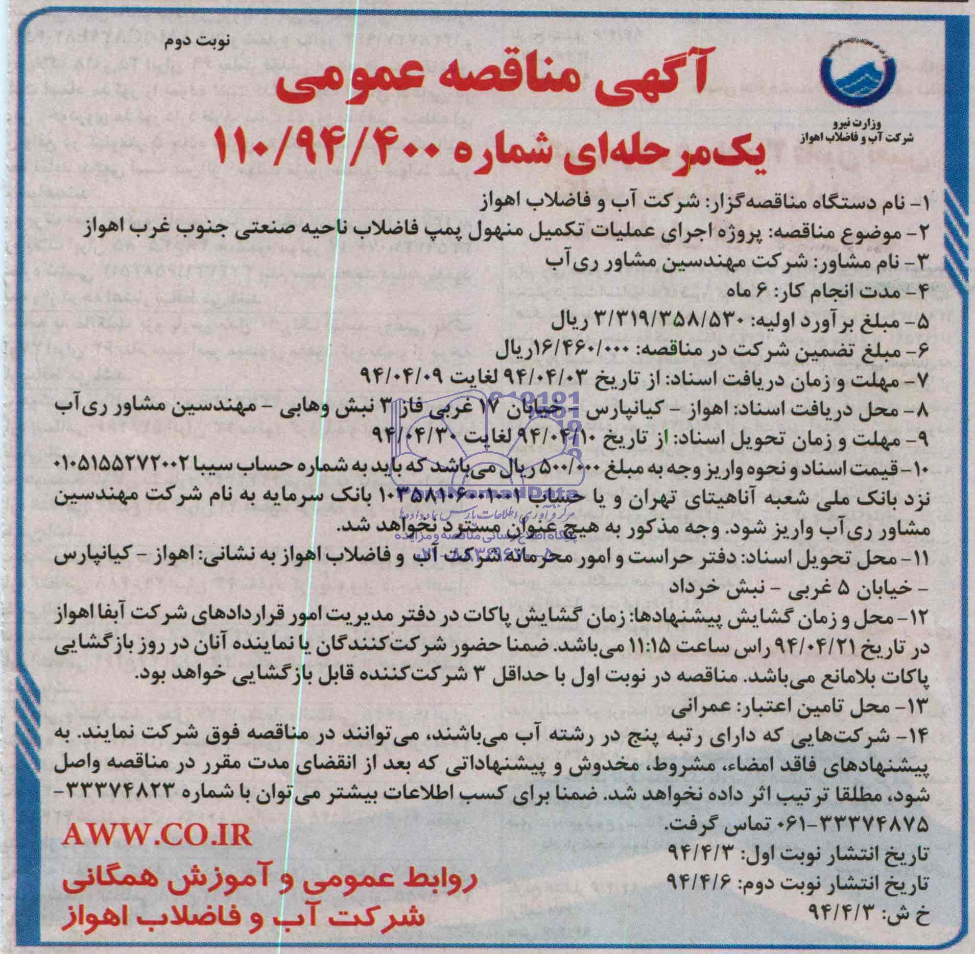 محل و زمان گشایش پیشنهادها: زمان گشایش پاکات در دفتر مدیریت قراردادهای شرکت آبفای اهواز در تاریخ 94.04.21 رأس ساعت 11:15 می باشد. ضمناً حضور شرکت کنندگان یا نماینده آنان در روز بازگشایی پاکات بلامانع می باشد.