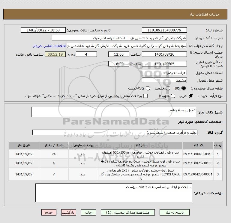 | 2 | 0971130076210103 | سه راهی لوله تبدیل جوشی بدون درز فولادی سایز 4x6 in مرجع عرضه کننده تقی رهنما کاشانی | عدد | 4 | 1401/09/05 |