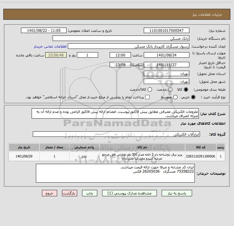 شرح کلی نیاز: ملزومات الکتریکی مصرفی مطابق پیش فاکتور پیوست. امضاءو ارائه پیش فاکتور الزامی بوده و عدم ارائه آن به منزله انصراف میباشد.
