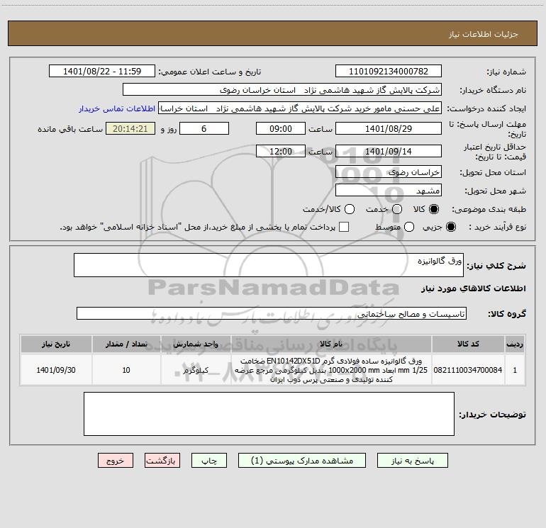 نام دستگاه خریدار:شرکت پالایش گاز شهید هاشمی نژاد استان خراسان رضوی