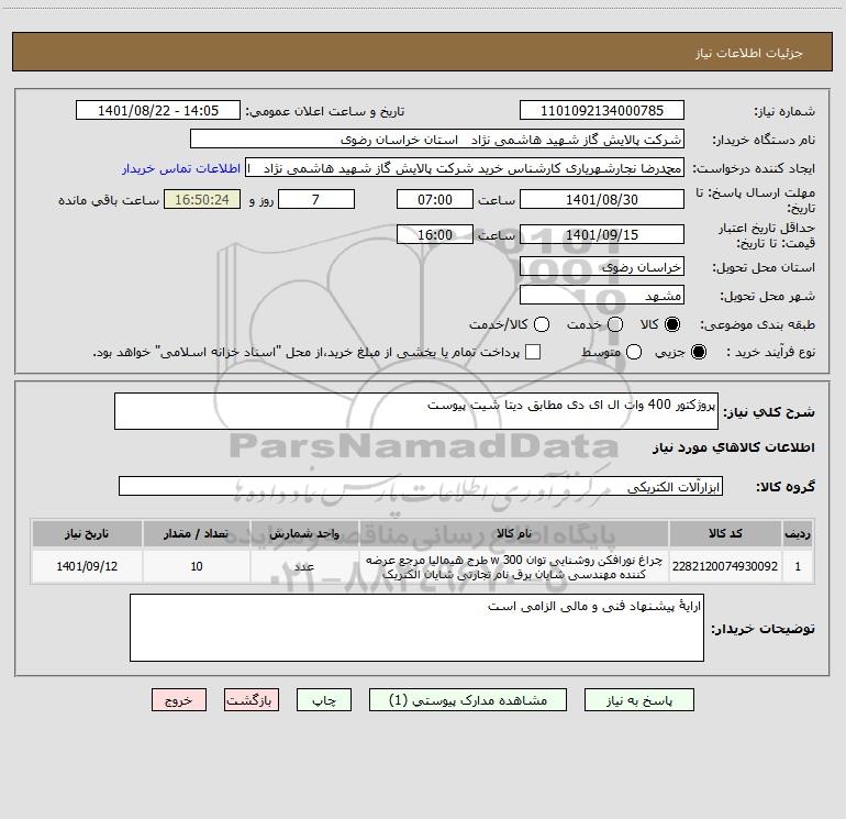 شرح کلی نیاز: پروژکتور 400 وات ال ای دی مطابق دیتا شیت پیوست
