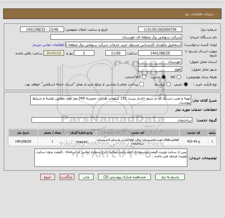 شرح کلی نیاز: تهیه و نصب دستک ها م سیم خاردار پست 132 کیلوولت هدایت حمیدیه 240 متر طول مطابق نقشه و شرایط پیوست.