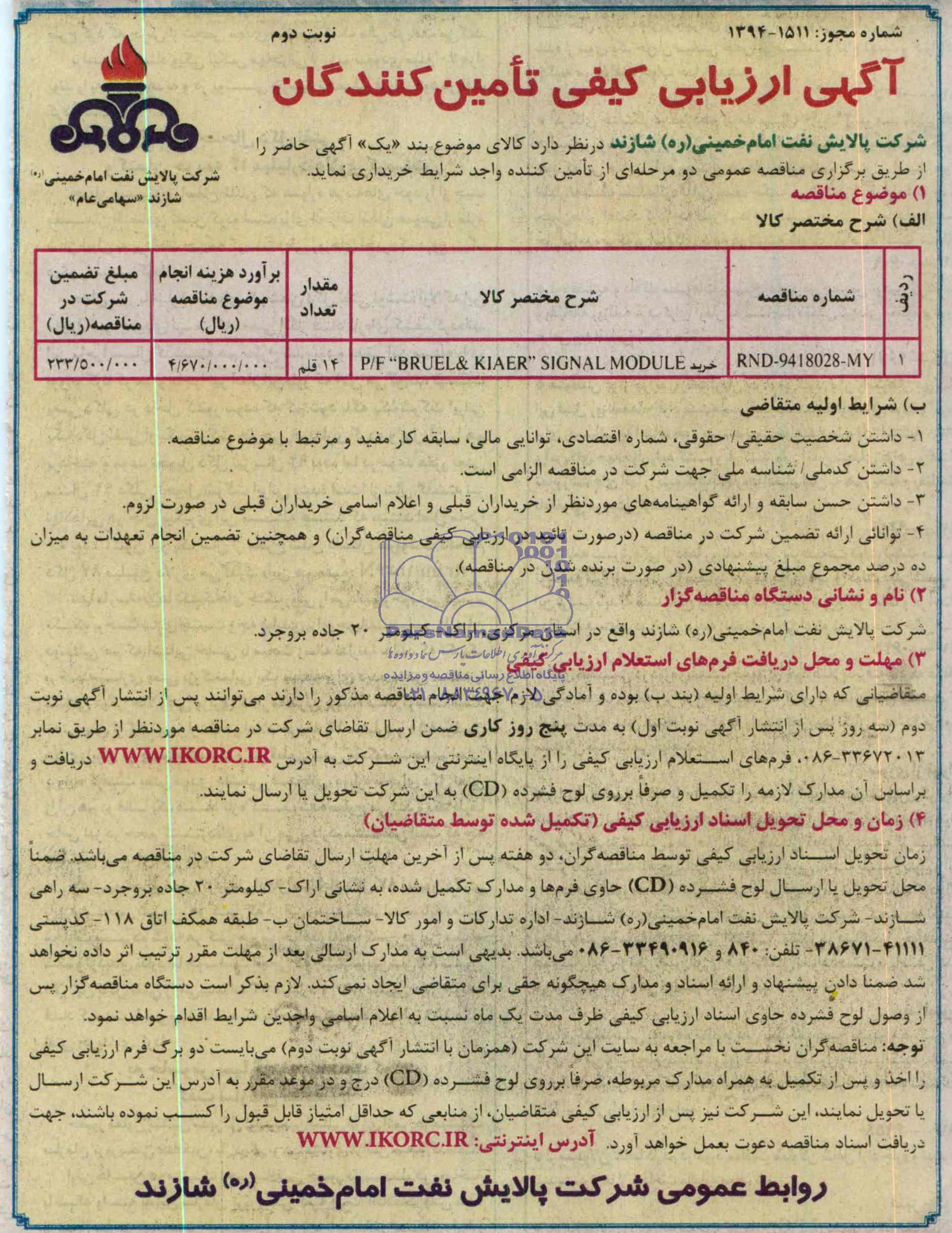 مناقصه خرید P/F BRUEL & KIAER SIGNAL MODULE , آگهی ارزیابی کیفی تامین کنندگان , مناقصه خرید P/F BRUEL & KIAER SIGNAL MODULE