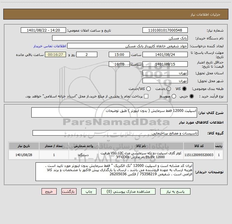شرح کلی نیاز: اسپلیت 12000 فقط سرمایش ( بدون اینورتر ) طبق توضیحات