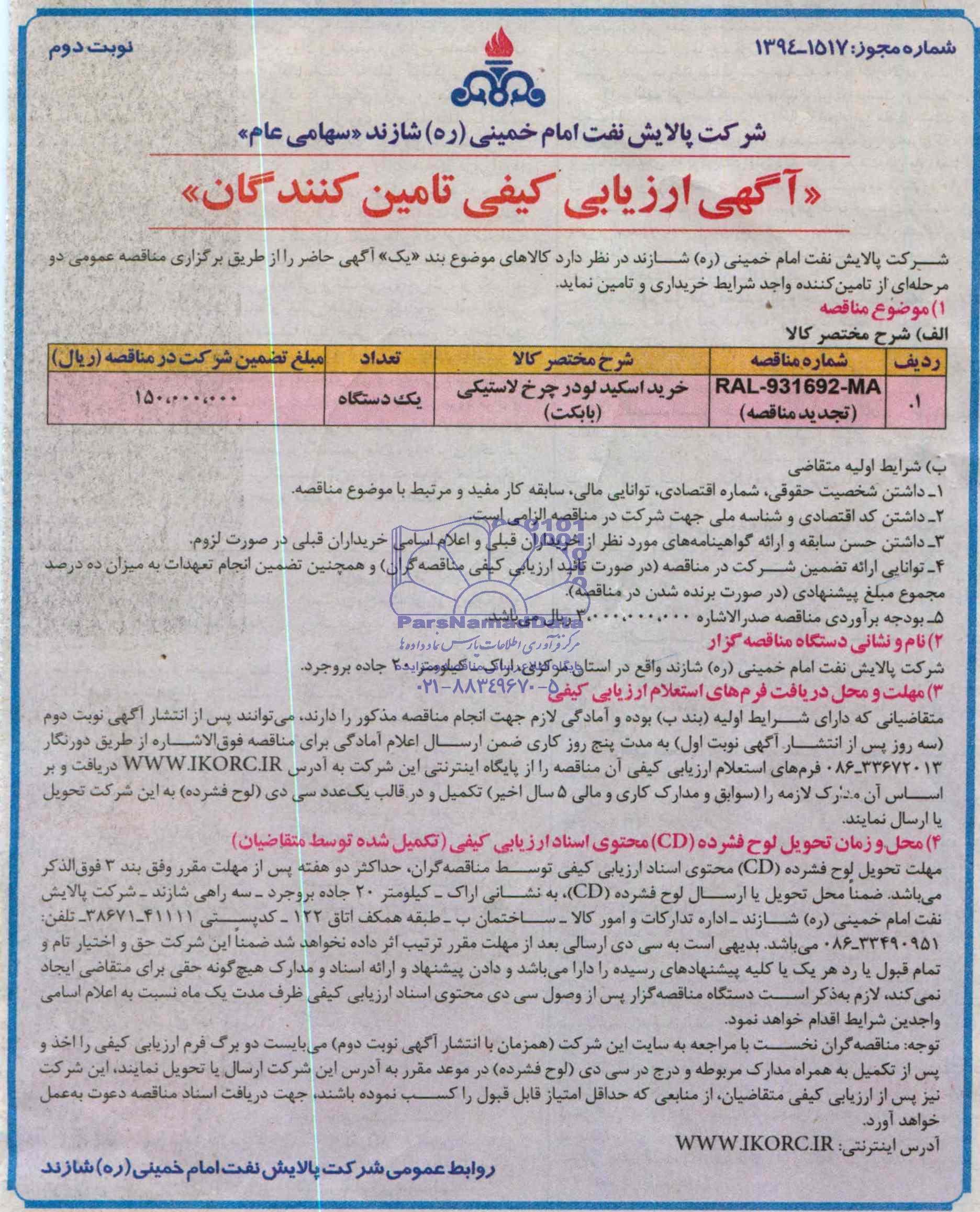 شماره مناقصه: RAL-931692-MA (تجدید مناقصه)