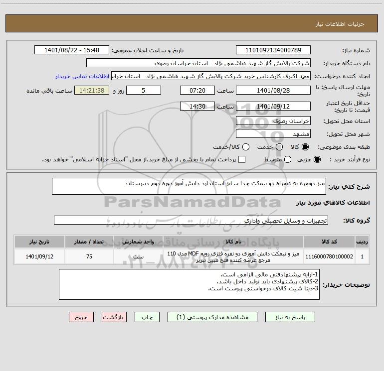 نام دستگاه خریدار:شرکت پالایش گاز شهید هاشمی نژاد استان خراسان رضوی