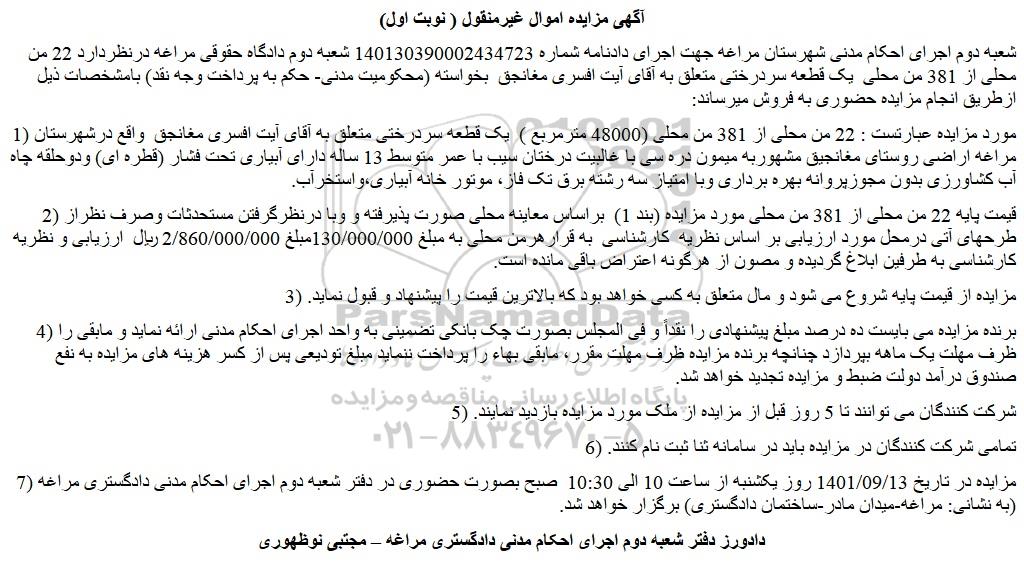 شعبه دوم اجرای احکام مدنی شهرستان مراغه جهت اجرای دادنامه شماره 140130390002434723 شعبه دوم دادگاه حقوقی مراغه درنظردارد 22 من محلی از 381 من محلی یک قطعه سردرختی متعلق به آقای آیت افسری مغانجق بخواسته (محکومیت مدنی- حکم به پرداخت وجه نقد) بامشخصات ذیل ازطریق انجام مزایده حضوری به فروش میرساند: