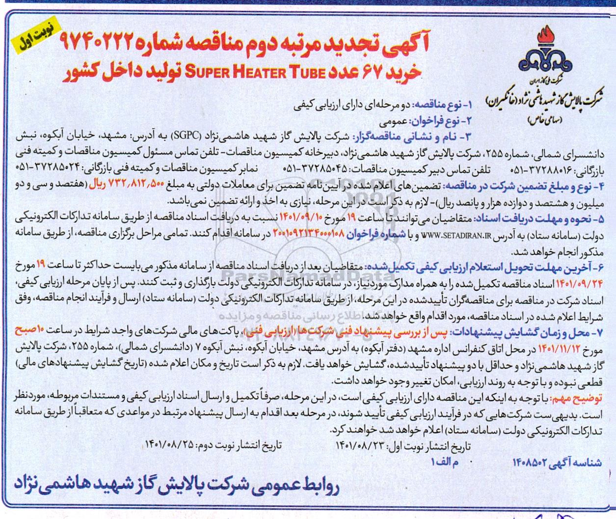 مناقصه خرید 67 عدد Super Heater Tube تجدید مرتبه دوم از کلیه افراد متخصص و شرکتها واجد شرایط دعوت به عمل میآید در مناقصه با کد خبرگزاری پارس نماد: 5143954 شرکت نمایند.