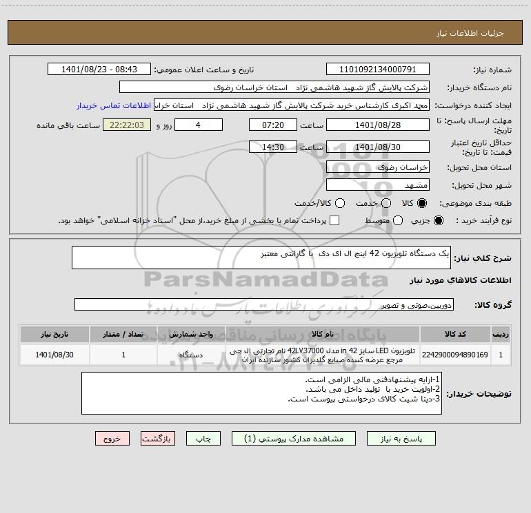 شرح کلی نیاز: یک دستگاه تلویزیون 42 اینچ ال ای دی با گارانتی معتبر