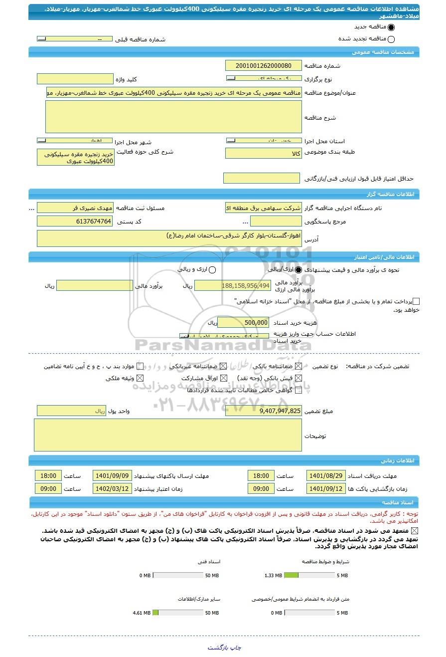 | مبلغ تضمین | 9,407,947,825 | واحد پول | ریال |