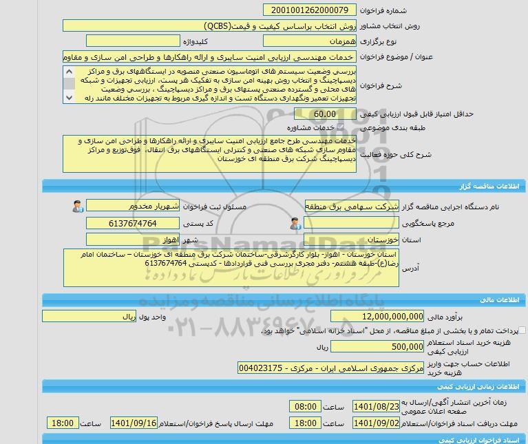 | نام دستگاه اجرایی مناقصه گزار | شرکت سهامی برق منطقه ای خوزستان | مسئول ثبت مناقصه | شهریار مخدوم |