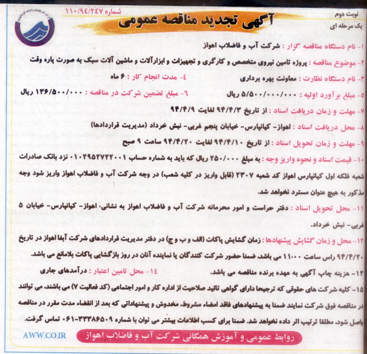 محل و زمان گشایش پیشنهادها: زمان گشایش پاکات (الف و ب و ج) در دفتر مدیریت قراردادهای شرکت آبفای اهواز در تاریخ 94.04.20 رأس ساعت 11 می باشد. ضمناً حضور شرکت کنندگان یا نماینده آنان در روز بازگشایی پاکات بلامانع می باشد. مناقصه در نوبت اول حداقل 3 شرکت کننده قابل بازگشایی خواهد بود