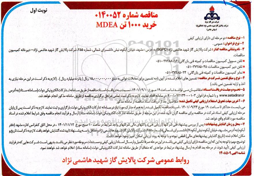 مناقصه خرید 1000 تن MDEA از کلیه افراد متخصص و شرکتها واجد شرایط دعوت به عمل میآید در مناقصه با کد خبرگزاری پارس نماد: 5144637 شرکت نمایند.