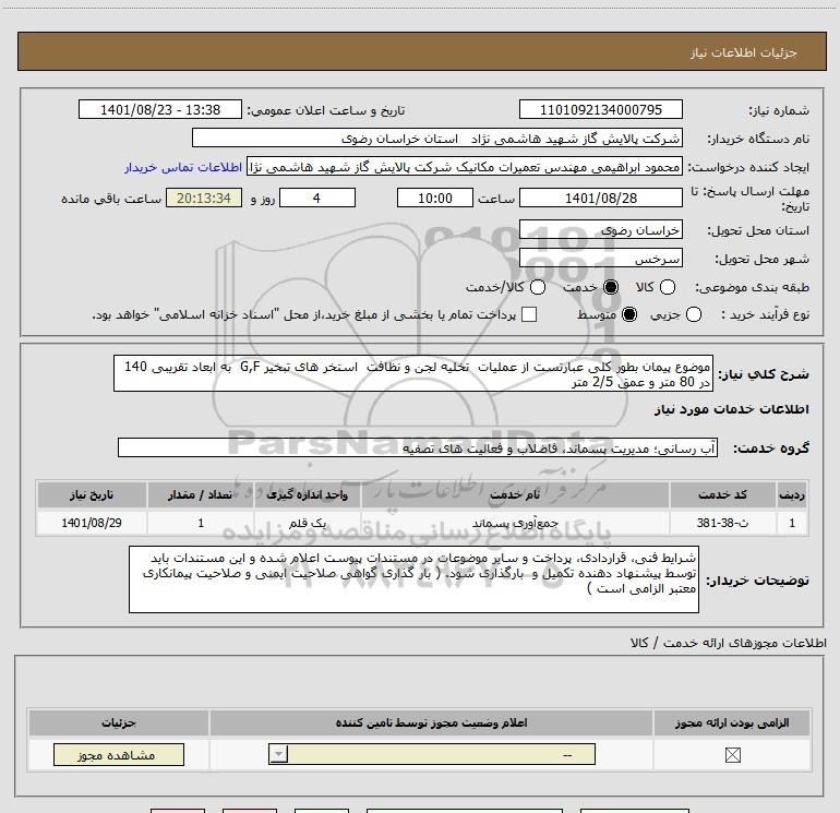 شرح کلی نیاز: موضوع پیمان بطور کلی عبارتست از عملیات تخلیه لجن و نظافت استخر های تبخیر G,F به ابعاد تقریبی 140 در 80 متر و عمق 2/5 متر