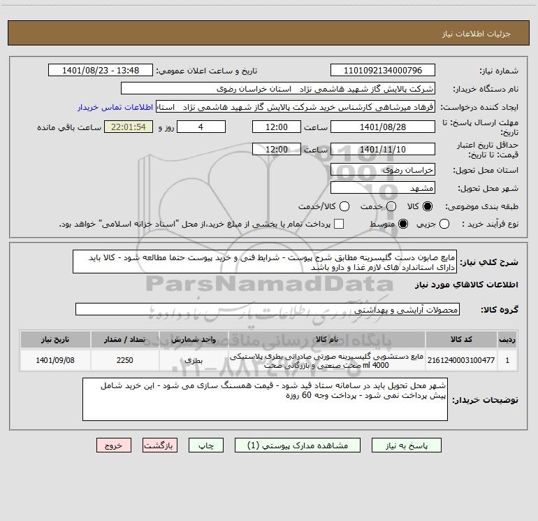 نام دستگاه خریدار:شرکت پالایش گاز شهید هاشمی نژاد استان خراسان رضوی