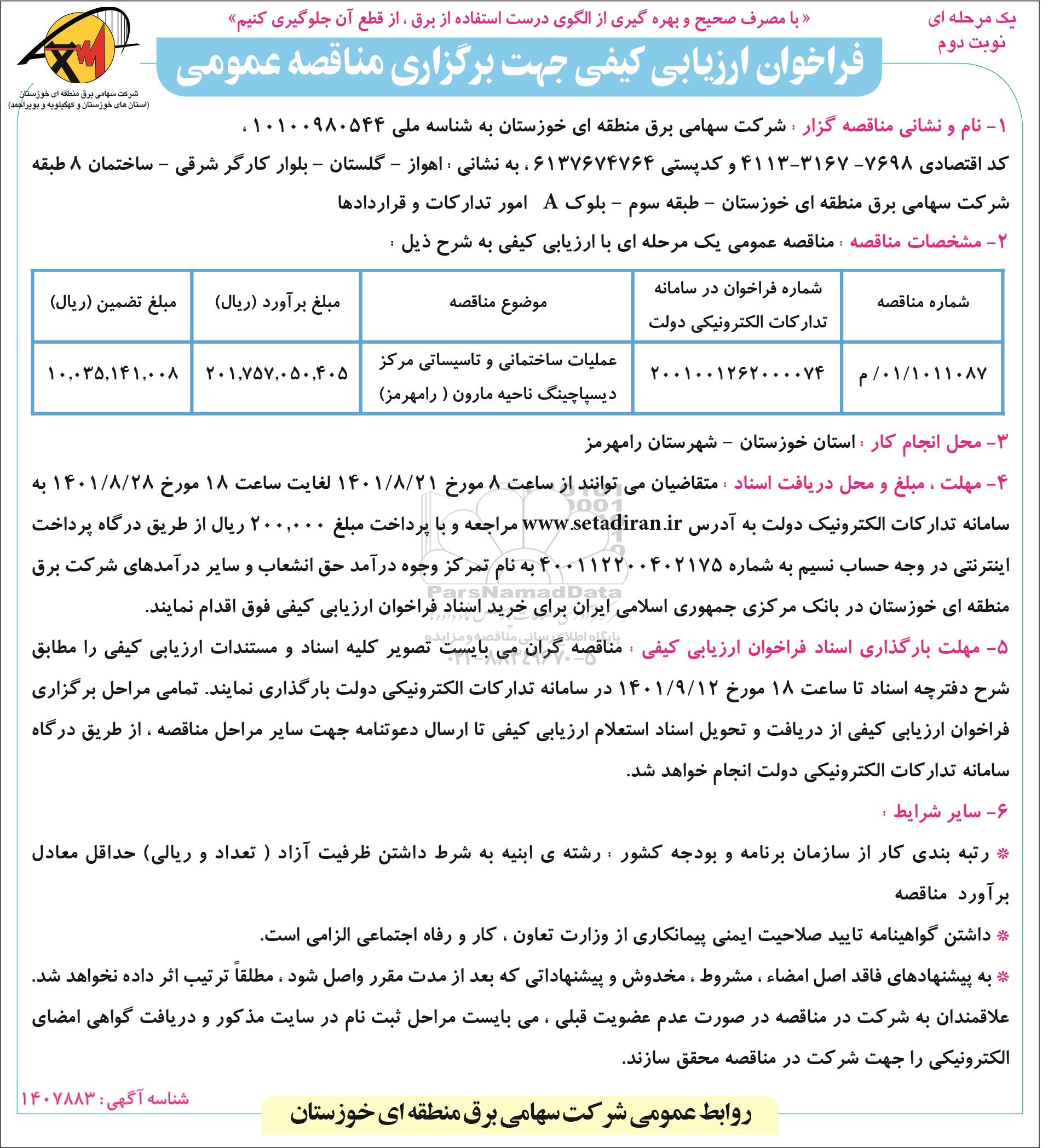 | 1011087/ 01/ م | 2001001262000074 | عملیات ساختمانی و تاسیساتی مرکز دیسپاچینگ ناحیه مارون رامهرمز | 201.757.050.405 | 10.035.141.008 |