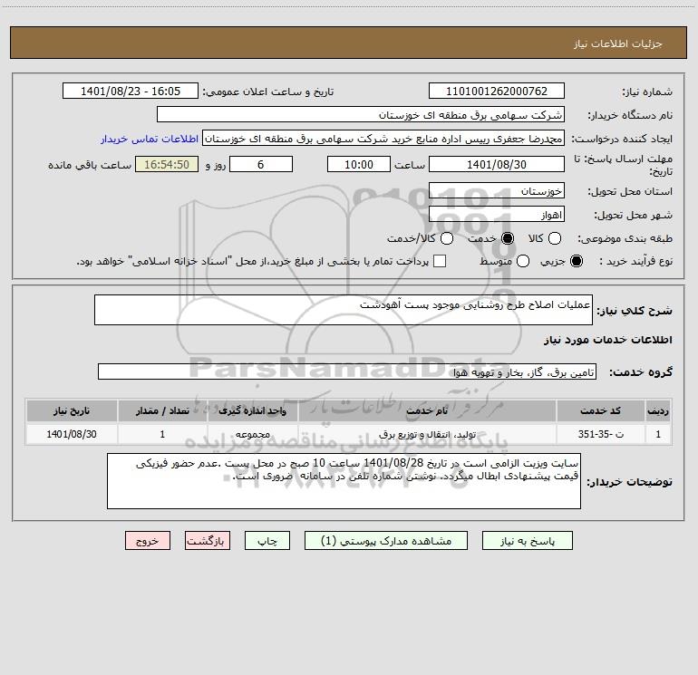 شرح کلی نیاز: عملیات اصلاح طرح روشنایی موجود پست آهودشت