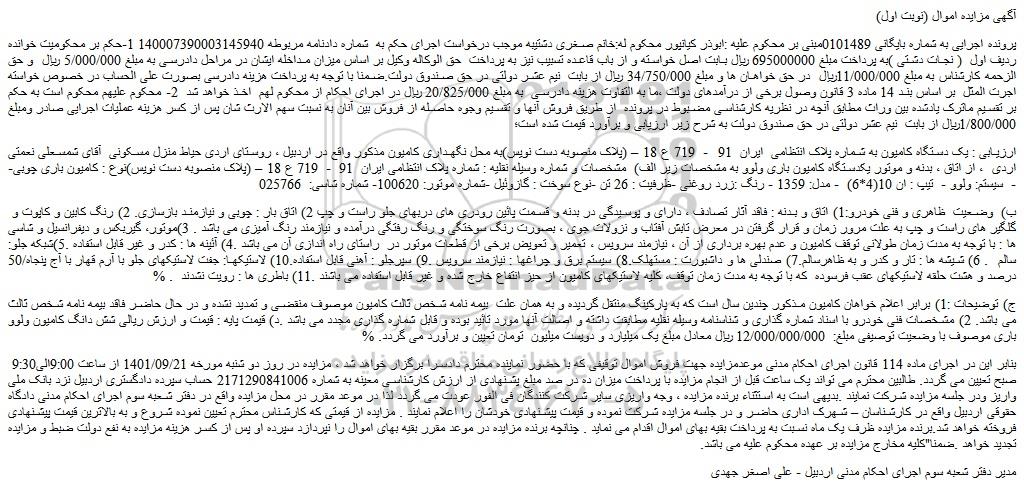 ارزیابی : یک دستگاه کامیون به شماره پلاک انتظامی ایران 91 - 719 ع 18 – (پلاک منصوبه دست نویس)به محل نگهداری کامیون مذکور واقع در اردبیل ، روستای اردی حیاط منزل مسکونی آقای شمسعلی نعمتی اردی ، از اتاق ، بدنه و موتور یکدستگاه کامیون باری ولوو به مشخصات زیر الف) مشخصات و شماره وسیله نقلیه : شماره پلاک انتظامی ایران 91 - 719 ع 18 – (پلاک منصوبه دست نویس)نوع : کامیون باری چوبی-- سیستم: ولوو - تیپ : ان 10(4*6) - مدل: 1359 - رنگ :زرد روغنی -ظرفیت : 26 تن -نوع سوخت : گازوئیل -شماره موتور: 100620- شماره شاسی: 025766