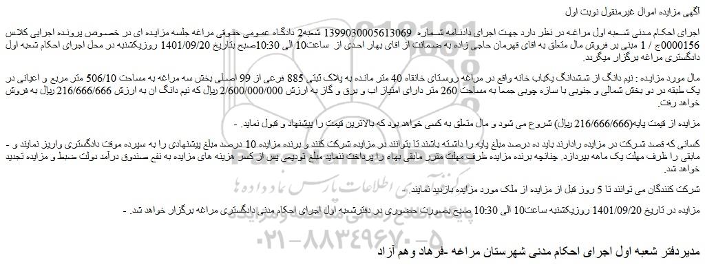 اجرای احکام مدنی شعبه اول مراغه در نظر دارد جهت اجرای دادنامه شماره 1399030005613069 شعبه2 دادگاه عمومی حقوقی مراغه جلسه مزایده ای در خصوص پرونده اجرایی کلاس 0000156ج / 1 مبنی بر فروش مال متعلق به اقای قهرمان حاجی زاده به ضمانت از اقای بهار احدی از ساعت10 الی 10:30صبح بتاریخ 1401/09/20 روزیکشنبه در محل اجرای احکام شعبه اول دادگستری مراغه برگزار میگردد.