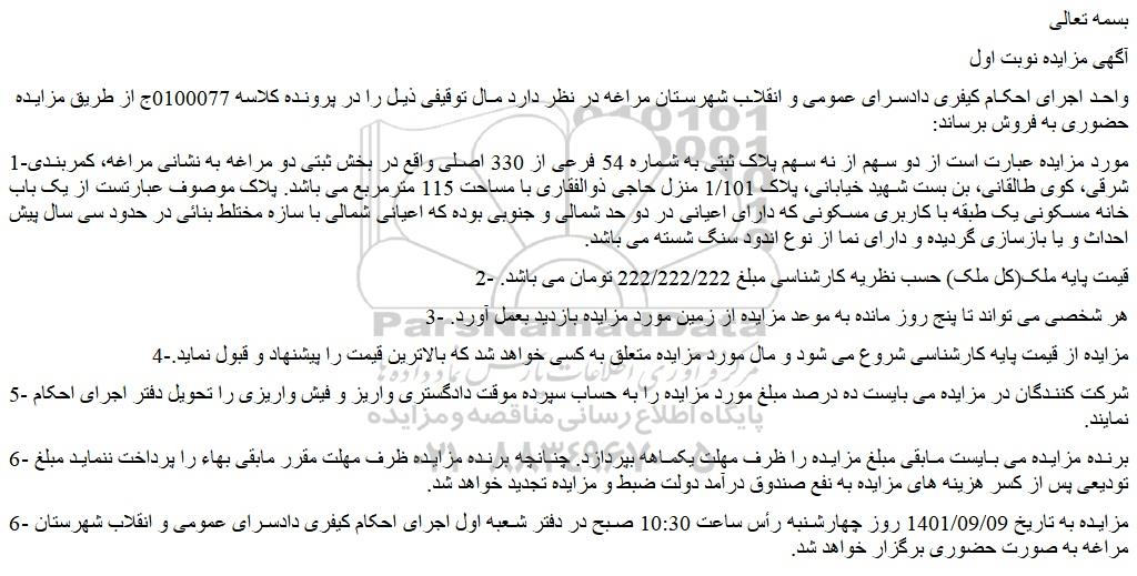 6- مزایده به تاریخ 1401/09/09 روز چهارشنبه رأس ساعت 10:30 صبح در دفتر شعبه اول اجرای احکام کیفری دادسرای عمومی و انقلاب شهرستان مراغه به صورت حضوری برگزار خواهد شد.