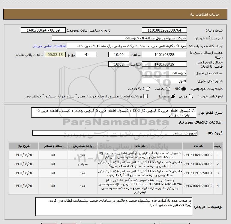 استعلام کپسول اطفاء حریق 3 کیلویی گاز CO2 + کپسول اطفاء حریق 6 کیلویی پودری + کپسول اطفاء حریق 6 لیتری آب و گاز + جایگاه نصب کپسول MDF(مطابق پیوست), استعلام کپسول اطفاء حریق 3 کیلویی گاز CO2 + کپسول اطفاء حریق 6 کیلویی پودری + کپسول اطفاء حریق 6 لیتری آب و گاز + جایگاه نصب کپسول MDF(مطابق پیوست)