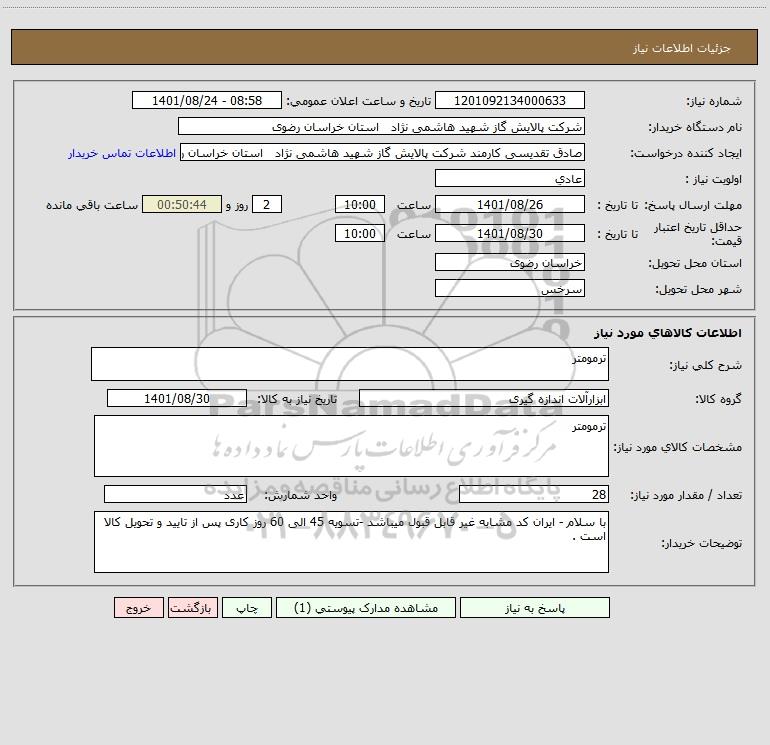 نام دستگاه خریدار:شرکت پالایش گاز شهید هاشمی نژاد استان خراسان رضوی