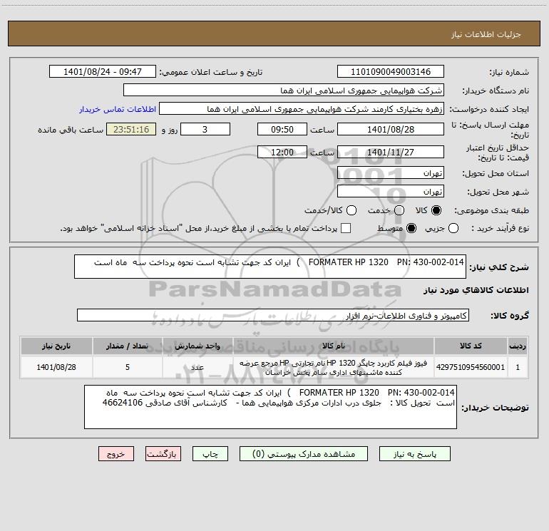 شرح کلی نیاز: FORMATER HP 1320 PN: 430-002-014 ) ایران کد جهت تشابه است نحوه پرداخت سه ماه است