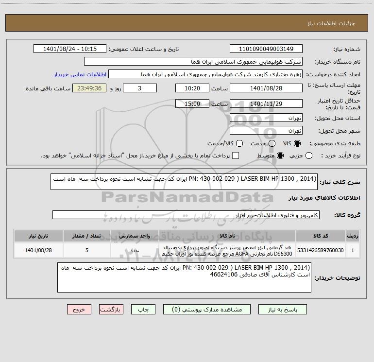 شرح کلی نیاز: (PN: 430-002-029 ) LASER BIM HP 1300 , 2014 ایران کد جهت تشابه است نحوه پرداخت سه ماه است