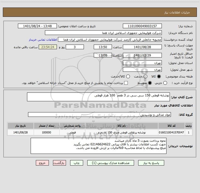 شرح کلی نیاز: نوشابه قوطی 150 سی سی در 3 طعم 100 هزار قوطی