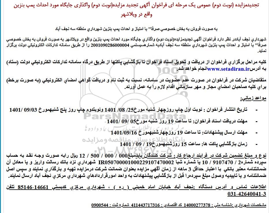 شهرداری نجف آباددر نظر دارد فراخوان آگهی تجدیدمزایده (نوبت دوم) واگذاری جایگاه مورد احداث پمپ بنزین واقع در ویلاشهر به صورت فروش به بخش خصوصی صرفا" با امتیاز و احداث پمپ بنزین شهرداری منطقه سه نجف آبادبه شمارهسیستمی 2001090286000004 را از طریق سامانه تداركات الكترونیكی دولت برگزار نماید.