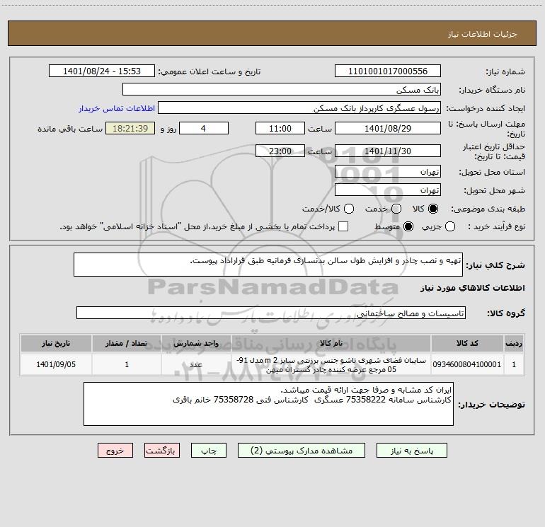 شرح کلی نیاز: تهیه و نصب چادر و افزایش طول سالن بدنسازی فرمانیه طبق قراراداد پیوست.