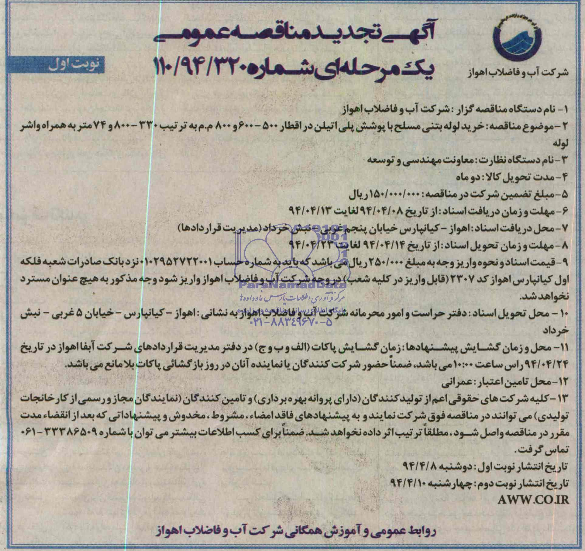 تجدید مناقصه خرید لوله بتنی مسلح با پوشش پلی اتیلن از کلیه افراد متخصص و شرکتها واجد شرایط دعوت به عمل میآید در مناقصه با کد خبرگزاری پارس نماد: 515419 شرکت نمایند.