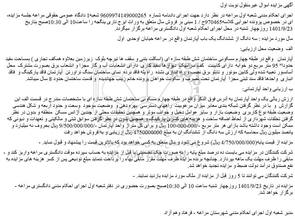 - مزایده در تاریخ 1401/9/23 روزچهار شنبه ساعت 10 الی 10:30صبح بصورت حضوری در دفترشعبه اول اجرای احکام مدنی دادگستری مراغه برگزار خواهد شد.