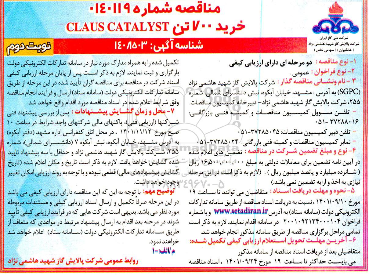 مناقصه خرید 700 تن CLAUS CATALYST - نوبت دوم از کلیه افراد متخصص و شرکتها واجد شرایط دعوت به عمل میآید در مناقصه با کد خبرگزاری پارس نماد: 5155200 شرکت نمایند.