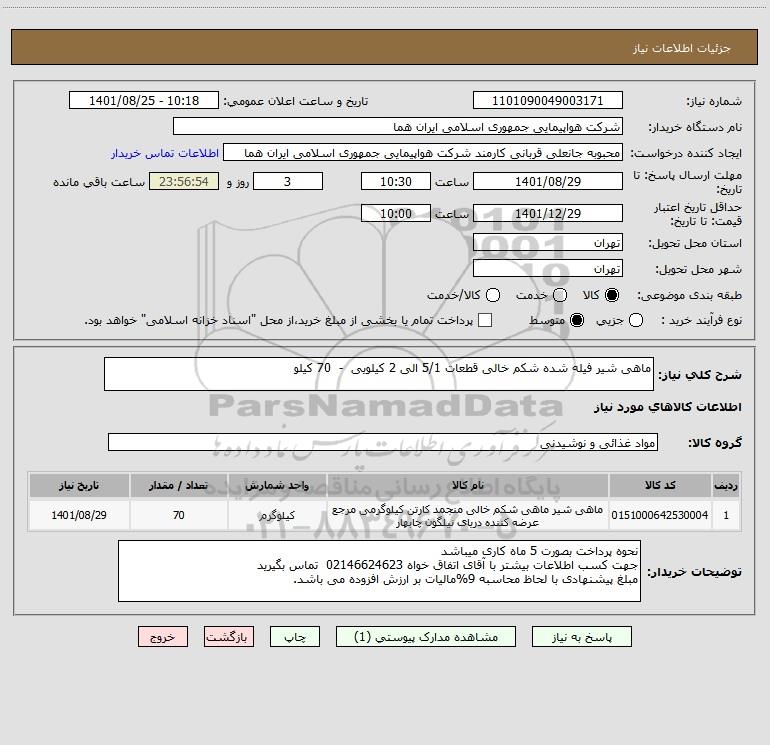 شرح کلی نیاز: ماهی شیر فیله شده شکم خالی قطعات 5/1 الی 2 کیلویی - 70 کیلو