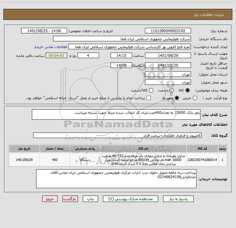 شرح کلی نیاز: پاور بانک 15000 به تعداد400عدد،ایران کد انتخاب شده صرفا جهت تشابه میباشد.