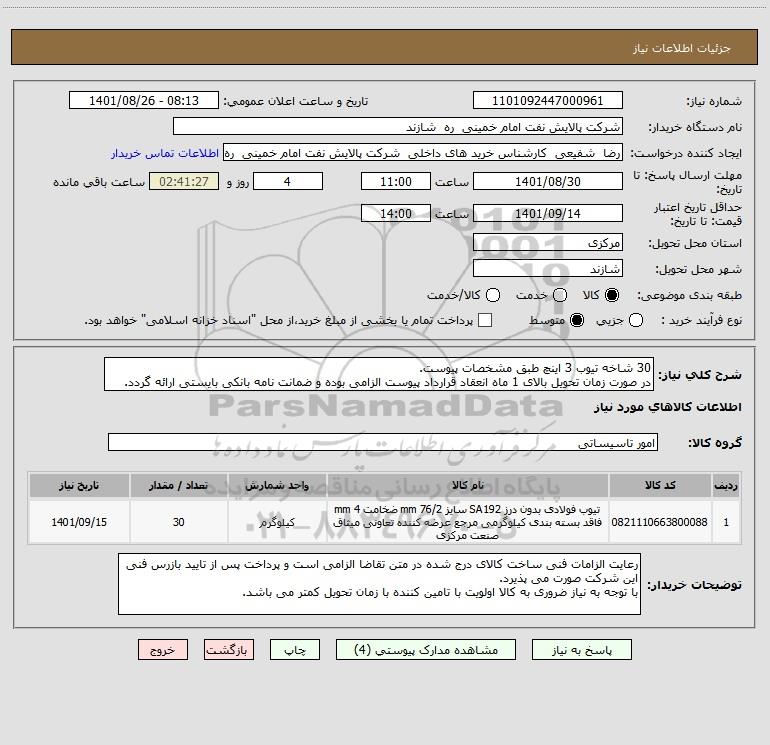 شرح کلی نیاز: 30 شاخه تیوب 3 اینچ طبق مشخصات پیوست.