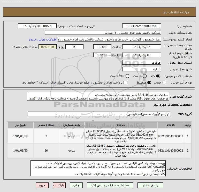 استعلام ساخت ناودانی SS.410 طبق مشخصات و نقشه پیوست. در صورت زمان تحویل کالا بیش از 1 ماه، قرارداد پیوست بایستی منعقد گردیده و ضمانت نامه بانکی ارائه گردد., استعلام ساخت ناودانی SS.410 طبق مشخصات و نقشه پیوست. در صورت زمان تحویل کالا بیش از 1 ماه، قرارداد پیوست بایستی منعقد گردیده و ضمانت نامه بانکی ارائه گردد.