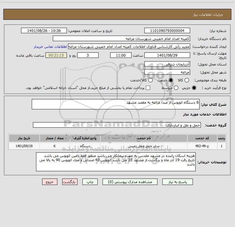 شرح کلی نیاز: 6 دستگاه اتوبوس از مبدا مراغه به مقصد مشهد