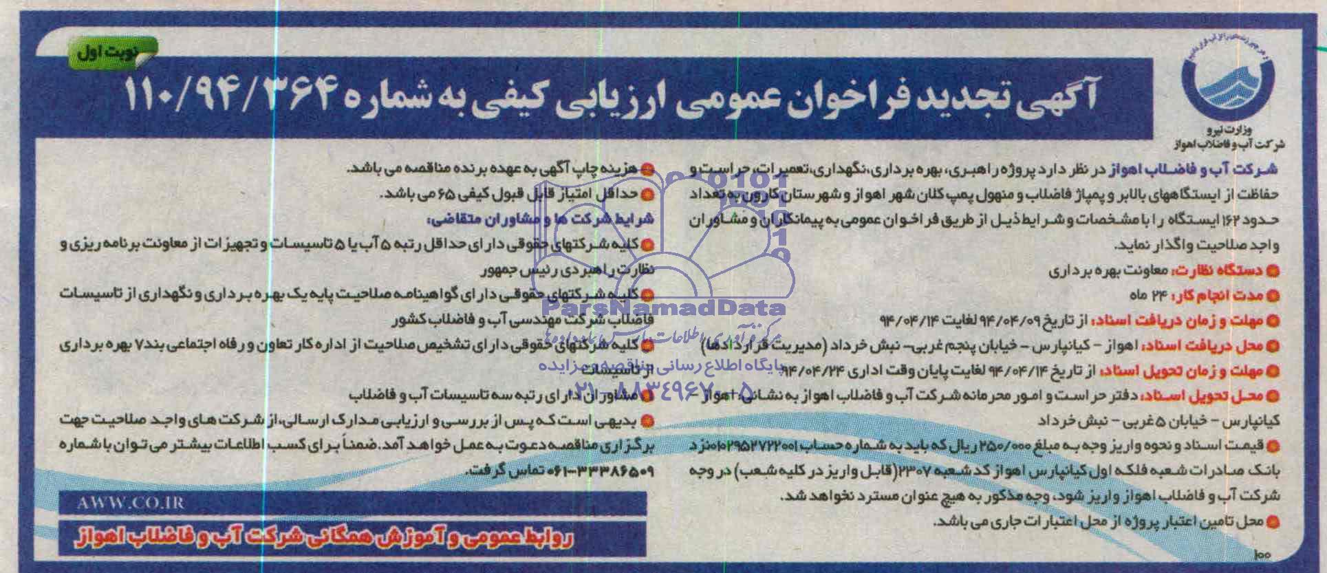 موضوع مناقصه: پروژه راهبری , بهره برداری , نگهداری , تعمیرات , حراست و حفاظت از ایستگاههای بالابر و پمپاژ فاضلاب و منهول پمپ کلان شهر اهواز و شهرستان کارون به تعداد حدود 162 ایستگاه را با مشخصات و شرایط ذیل از طریق فراخوان عمومی به پیمانکاران واجد صلاحیت واگذار نماید