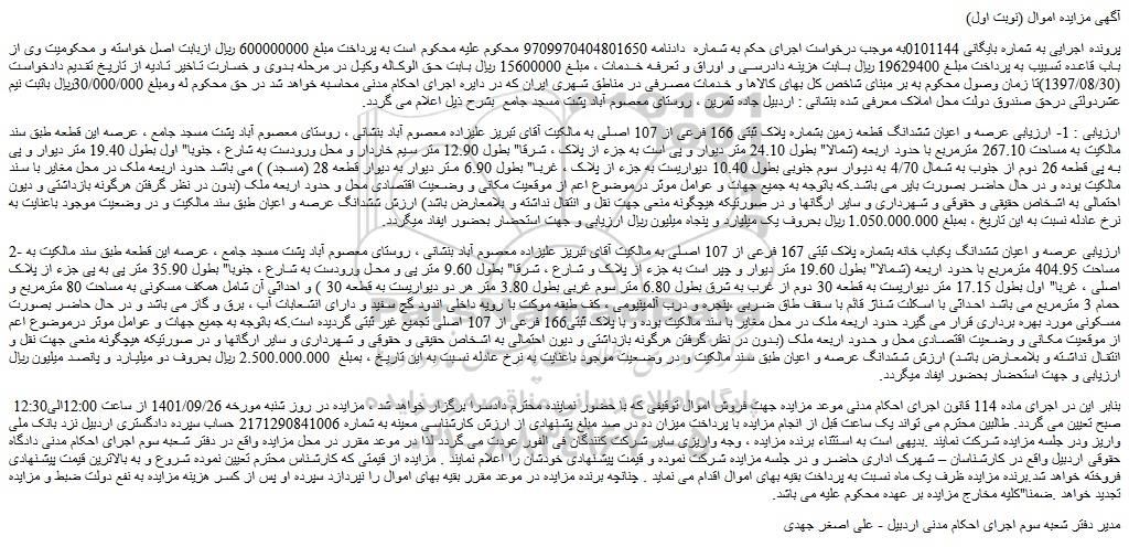 پرونده اجرایی به شماره بایگانی 0101144به موجب درخواست اجرای حکم به شماره دادنامه 9709970404801650 محکوم علیه محکوم است به پرداخت مبلغ 600000000 ریال ازبابت اصل خواسته و محکومیت وی از باب قاعده تسبیب به پرداخت مبلغ 19629400 ریال بابت هزینه دادرسی و اوراق و تعرفه خدمات ، مبلغ 15600000 ریال بابت حق الوکاله وکیل در مرحله بدوی و خسارت تاخیر تادیه از تاریخ تقدیم دادخواست (1397/08/30)تا زمان وصول محکوم به بر مبنای شاخص کل بهای کالاها و خدمات مصرفی در مناطق شهری ایران که در دایره اجرای احکام مدنی محاسبه خواهد شد در حق محکوم له ومبلغ 30/000/000ریال باتبت نیم عشردولتی درحق صندوق دولت محل املاک معرفی شده بنشانی : اردبیل جاده ثمرین ، روستای معصوم آباد پشت مسجد جامع بشرح ذیل اعلام می گردد.