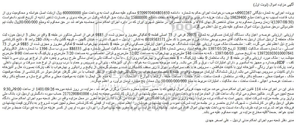 بنابر این در اجرای ماده 114 قانون اجرای احکام مدنی موعد مزایده جهت فروش اموال توقیفی که با حضور نماینده محترم دادسرا برگزار خواهد شد ، مزایده در روز شنبه مورخه 1401/09/26 از ساعت 9:00الی9:30 صبح تعیین می گردد. طالبین محترم می تواند یک ساعت قبل از انجام مزایده با پرداخت میزان ده در صد مبلغ پشنهادی از ارزش کارشناسی معینه به شماره 2171290841006 حساب سپرده دادگستری اردبیل نزد بانک ملی واریز ودر جلسه مزایده شرکت نمایند .بدیهی است به استثناء برنده مزایده ، وجه واریزی سایر شرکت کنندگان فی الفور عودت می گردد لذا در موعد مقرر در محل مزایده واقع در دفتر شعبه سوم اجرای احکام مدنی دادگاه حقوقی اردبیل واقع در کارشناسان – شهرک اداری حاضر و در جلسه مزایده شرکت نموده و قیمت پیشنهادی خودشان را اعلام نمایند . مزایده از قیمتی که کارشناس محترم تعیین نموده شروع و به بالاترین قیمت پیشنهادی فروخته خواهد شد.برنده مزایده ظرف یک ماه نسبت به پرداخت بقیه بهای اموال اقدام می نماید . چنانچه برنده مزایده در موعد مقرر بقیه بهای اموال را نپردازد سپرده او پس از کسر هزینه مزایده به نفع دولت ضبط و مزایده تجدید خواهد .ضمنا"کلیه مخارج مزایده بر عهده محکوم علیه می باشد.