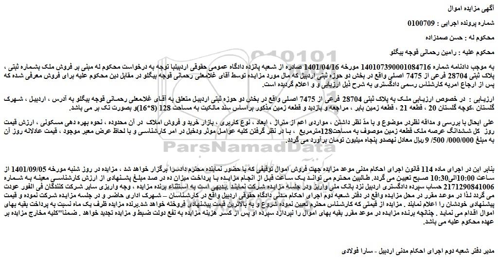 ، به موجب دادنامه شماره 140107390001084716 مورخه 1401/04/16 صادره از شعبه پانزده دادگاه عمومی حقوقی اردبیلبا توجه به درخواست محکوم له مبنی بر فروش ملک بشماره ثبتی پلاک ثبتی 28704 فرعی از 7475 اصلی واقع در بخش دو حوزه ثبتی اردبیل که مال مورد مزایده توسط آقای غلامعلی رحمانی قوجه بیگلو در مقابل دین محکوم علیه برای فروش معرفی شده که پس از ارجاع امربه کارشناس رسمی دادگستری به شرح ذیل ارزیابی و و اعلام گردیده است.