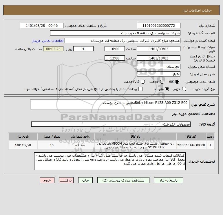 شرح کلی نیاز: Relay Micom P123 A00 Z312 EC0مطابق با شرح پیوست