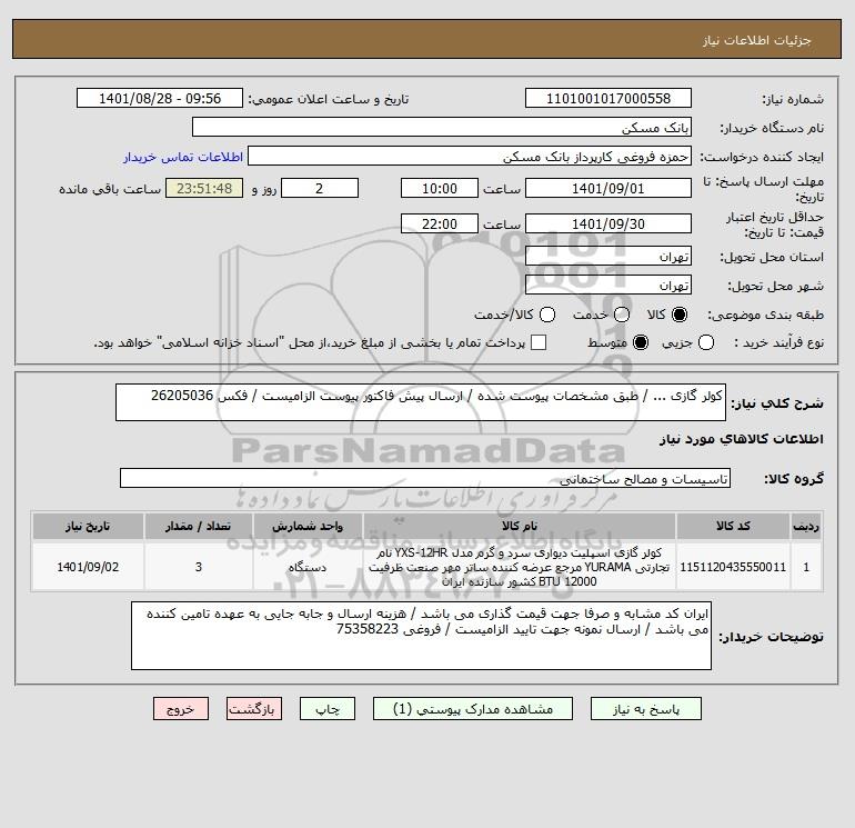 شرح کلی نیاز: کولر گازی ... / طبق مشخصات پیوست شده / ارسال پیش فاکتور پیوست الزامیست / فکس 26205036