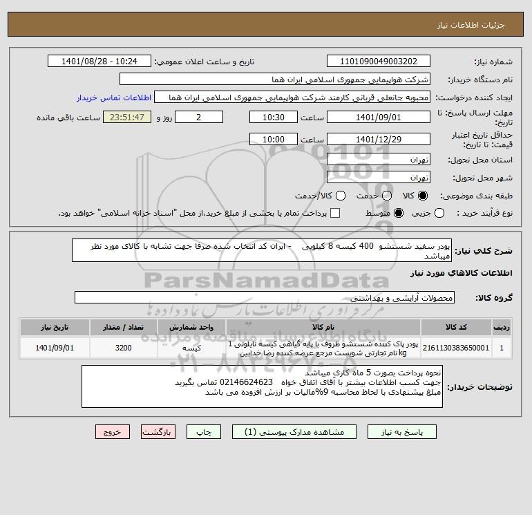 شرح کلی نیاز: پودر سفید شستشو 400 کیسه 8 کیلویی - ایران کد انتخاب شده صرفا جهت تشابه با کالای مورد نظر میباشد